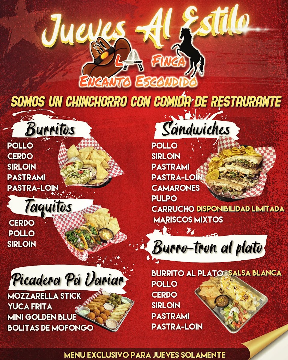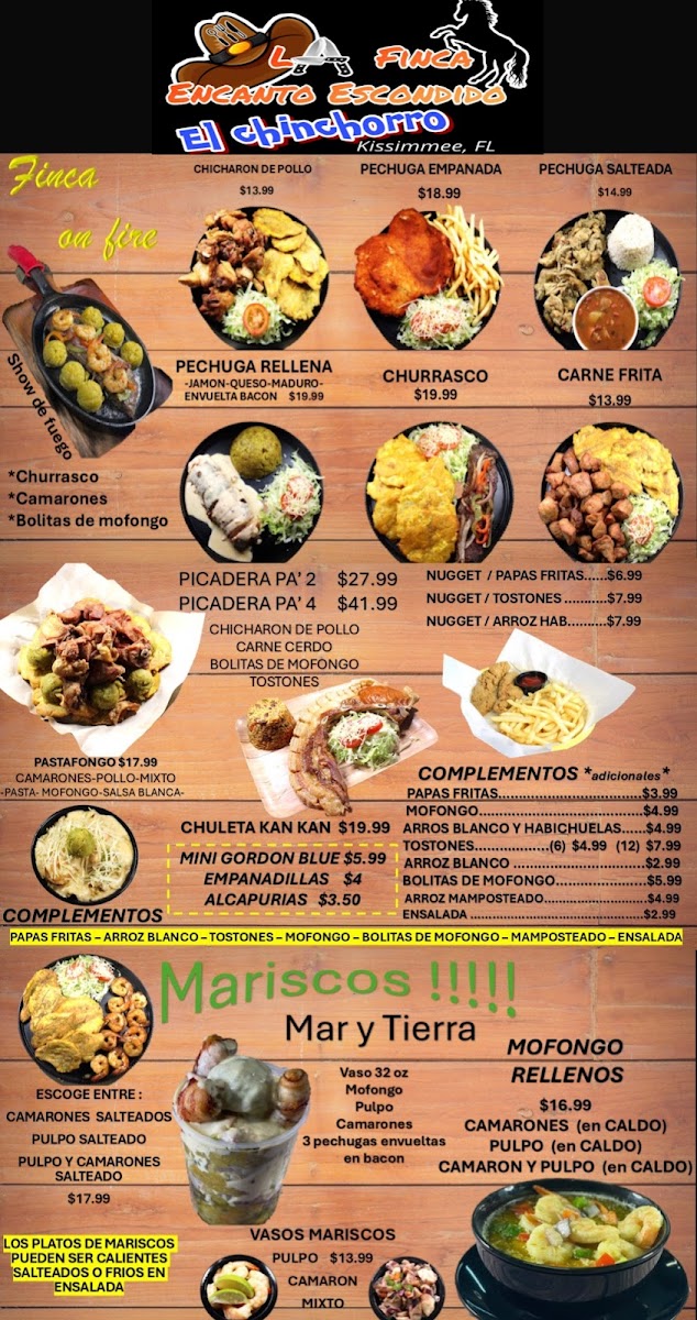 Welcome to La Finca Encanto Escondido, a vibrant Puerto Rican restaurant nestled in the heart of Kissimmee's Main Gate Flea Market. This Nuevo Latino culinary gem offers a delightful menu that celebrates the rich flavors of Latin America. Highlights include the sizzling Churrasco and the savory Camarones, each dish cooked to perfection. For seafood lovers, the Pulpo and Camaron Mixto, both priced at US$13.99, provide a taste of the ocean's bounty.